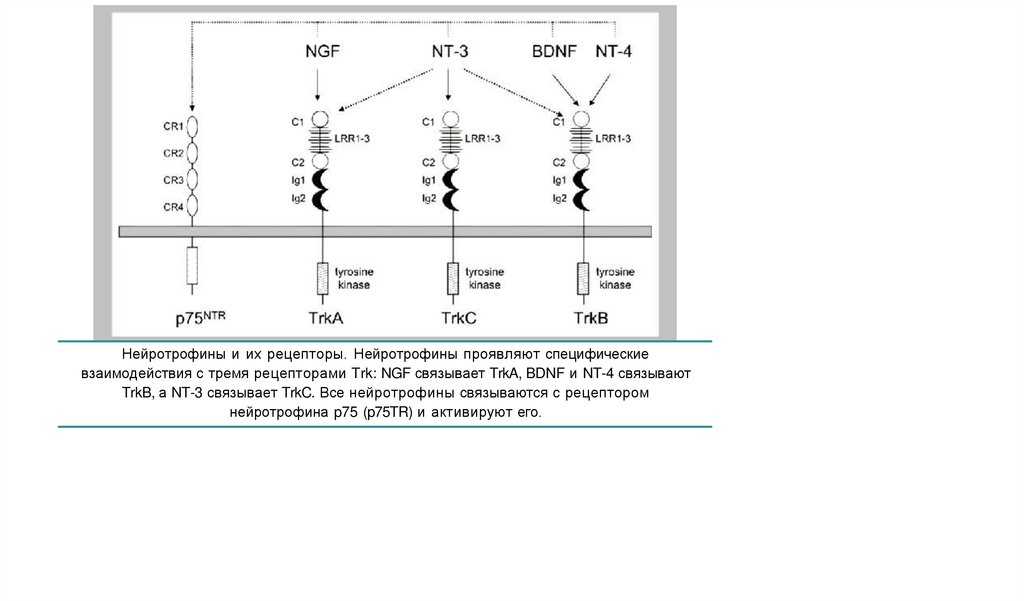 TrkB, а NT-3 связывает TrkC. Все нейротрофины связываются с рецептором