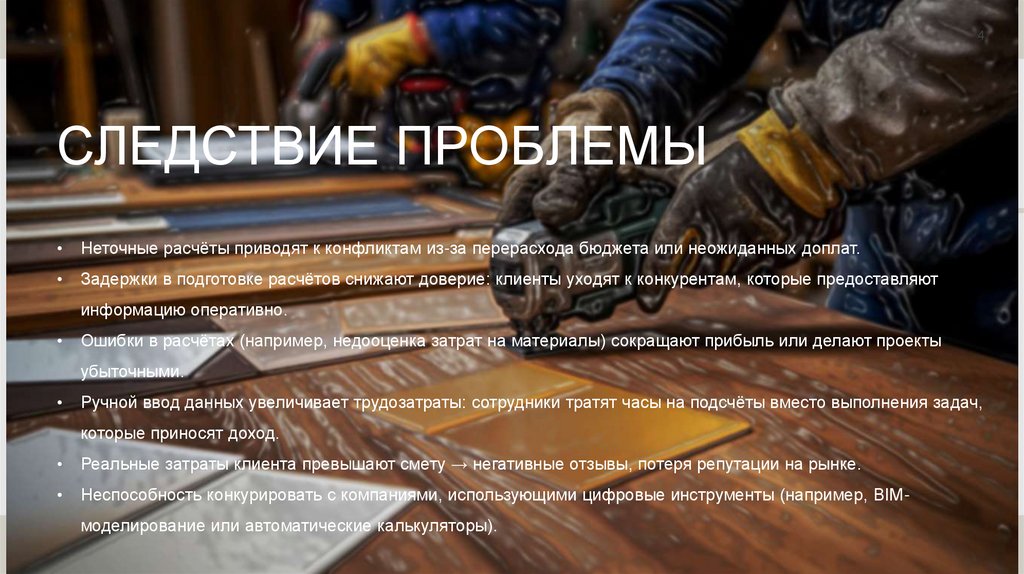 Неспособность конкурировать с компаниями, использующими цифровые инструменты (например, BIMмоделирование или автоматические калькуляторы).
