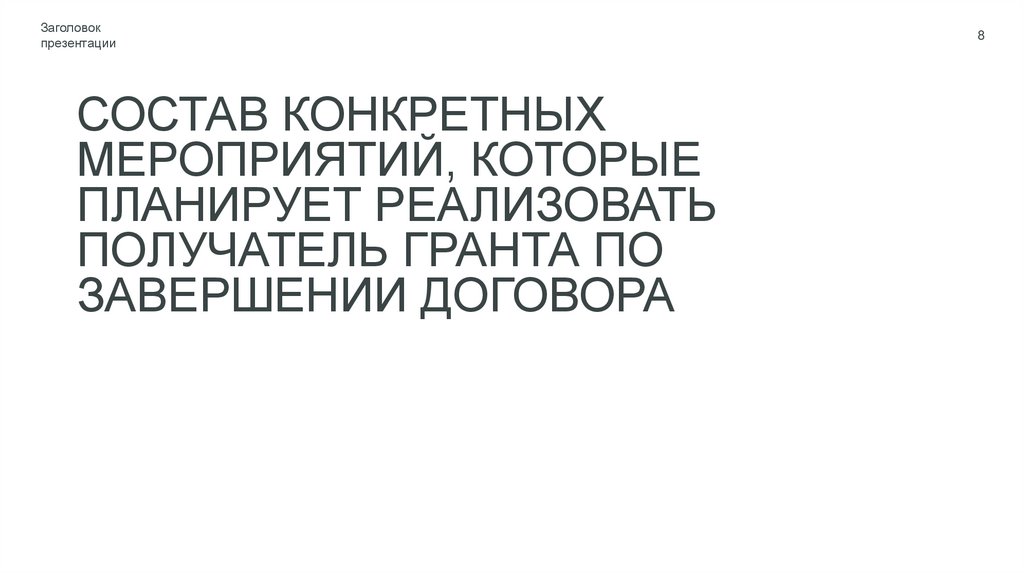 8. состав конкретных мероприятий, которые планирует реализовать Получатель гранта по завершении Договора