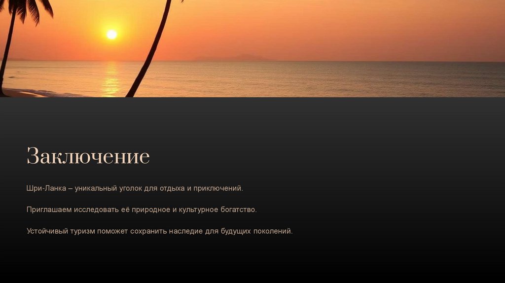 ЗаключениеШри-Ланка – уникальный уголок для отдыха и приключений.