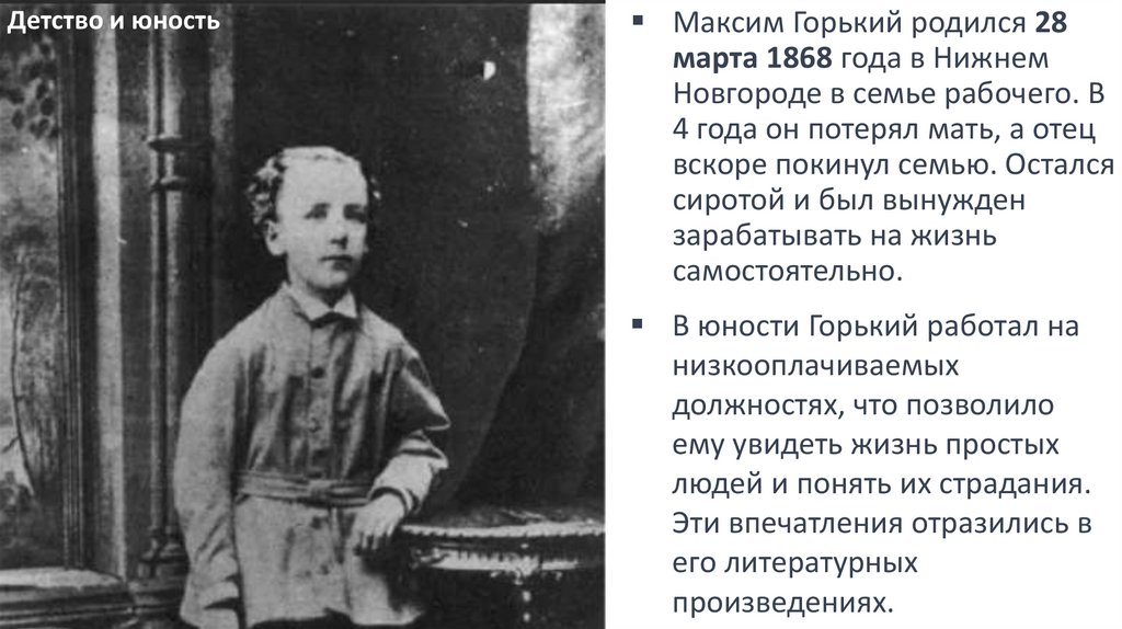 1. Максим Горький родился 28 марта 1868 года в Нижнем Новгороде в семье рабочего. В 4 года он потерял мать, а отец вскоре покинул