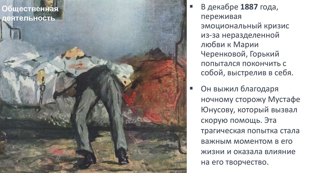 2. В декабре 1887 года, переживая эмоциональный кризис из-за неразделенной любви к Марии Черенковой, Горький попытался покончить с