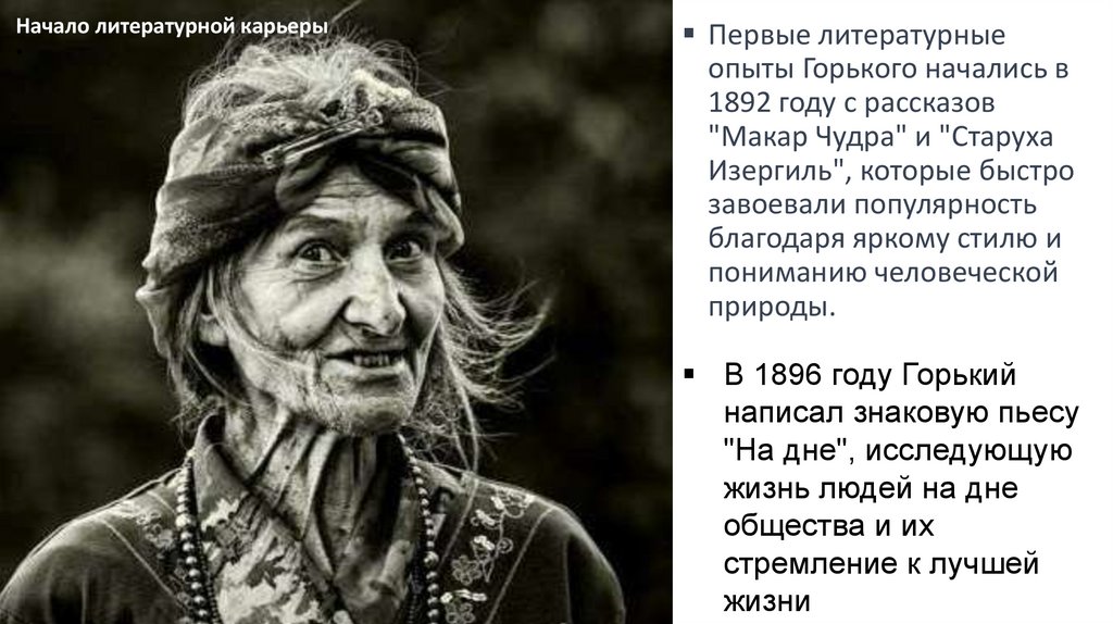 3. Первые литературные опыты Горького начались в 1892 году с рассказов "Макар Чудра" и "Старуха Изергиль", которые быстро