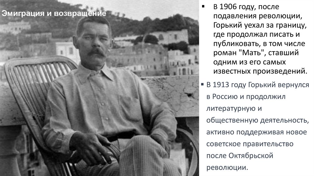 5. В 1906 году, после подавления революции, Горький уехал за границу, где продолжал писать и публиковать, в том числе роман