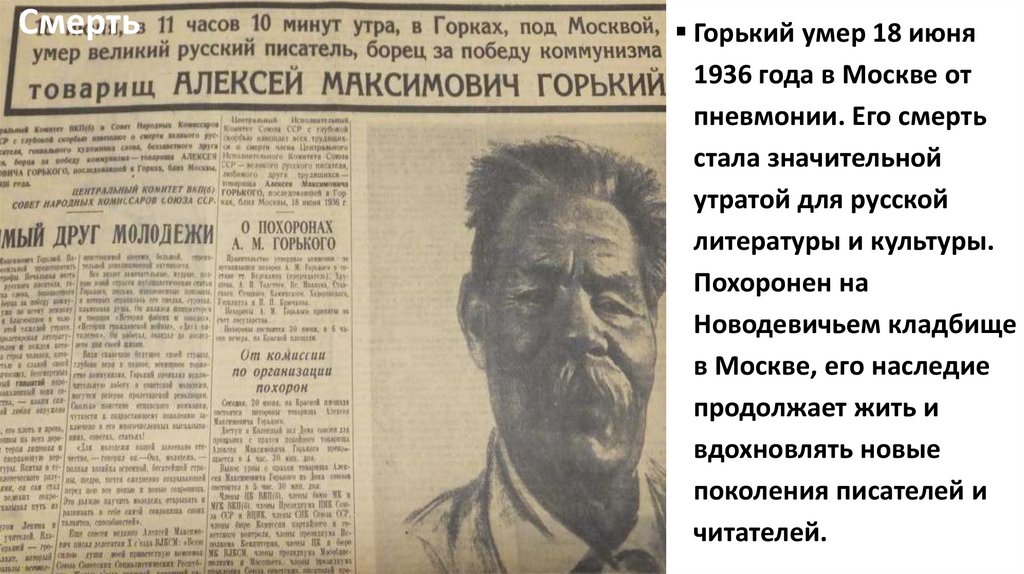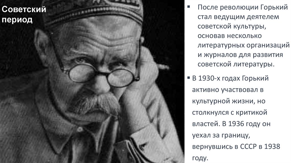 6. После революции Горький стал ведущим деятелем советской культуры, основав несколько литературных организаций и журналов для