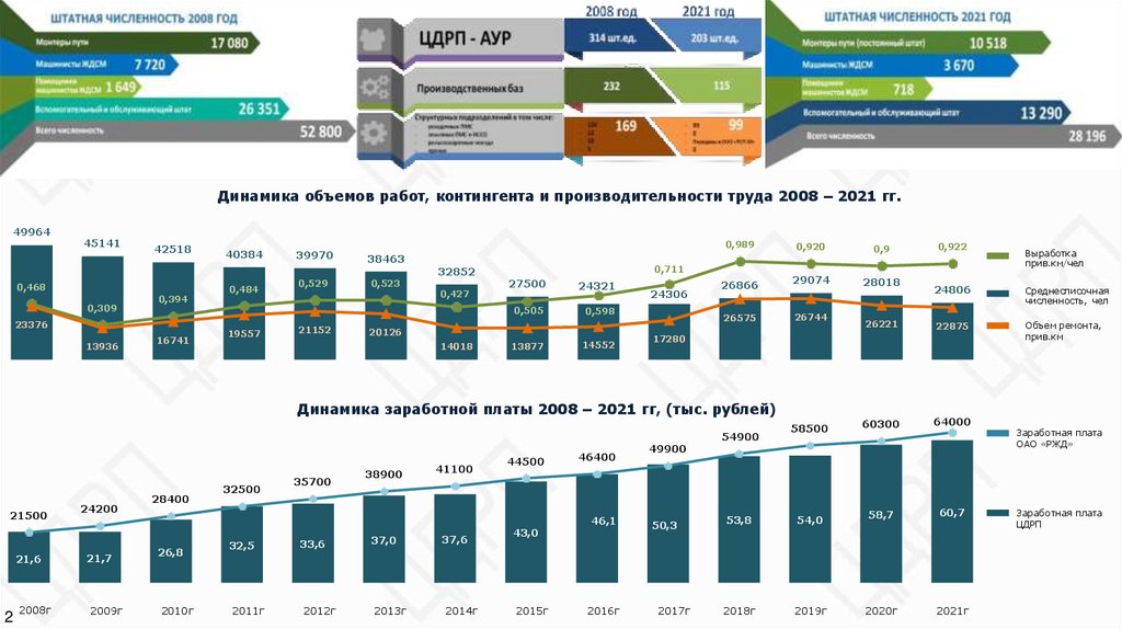 Динамика объемов работ, контингента и производительности труда 2008 – 2021 гг.49964