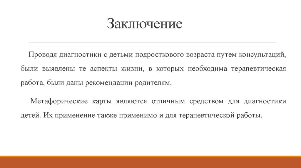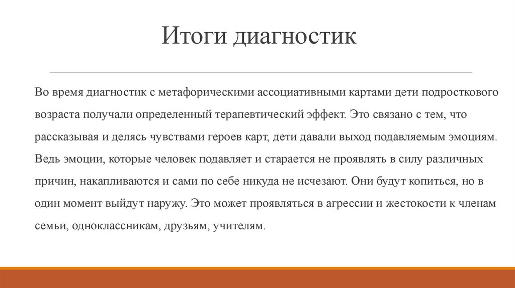 Во время диагностик с метафорическими ассоциативными картами дети подростковоговозраста получали определенный терапевтический эффект. Это связано с тем, что