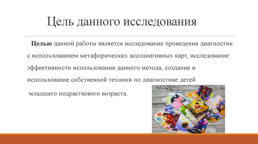 Целью данной работы является исследование проведения диагностикс использованием метафорических ассоциативных карт, исследование