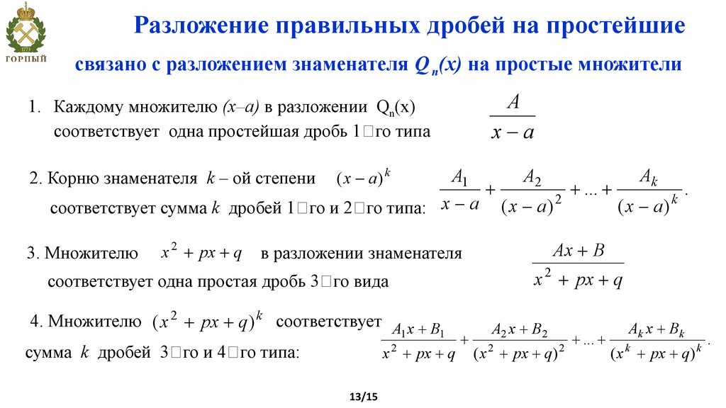 Разложение правильных дробей на простейшиесвязано с разложением знаменателя Q n(x) на простые множители