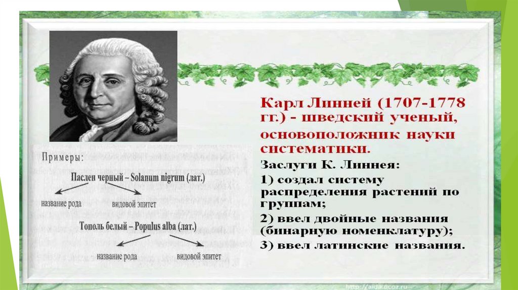 Вклад Линнея это введение бинарной, двойной. Она указывала на то, что