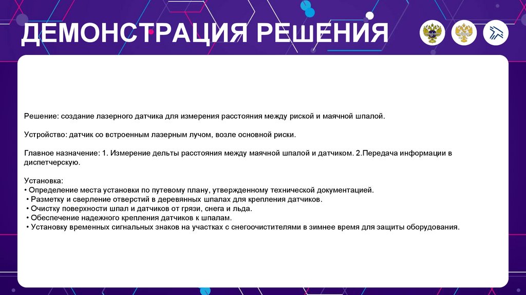 ДЕМОНСТРАЦИЯ РЕШЕНИЯРешение: создание лазерного датчика для измерения расстояния между риской и маячной шпалой.
