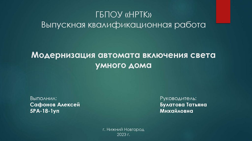 1. ГБПОУ «НРТК» Выпускная квалификационная работа Модернизация автомата включения света умного дома