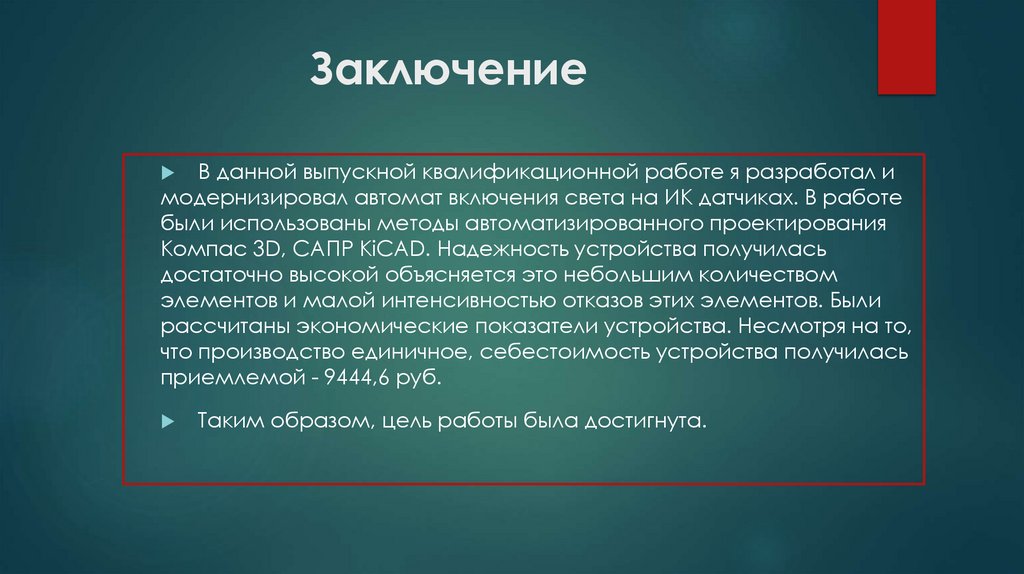 В данной выпускной квалификационной работе я разработал имодернизировал автомат включения света на ИК датчиках. В работе