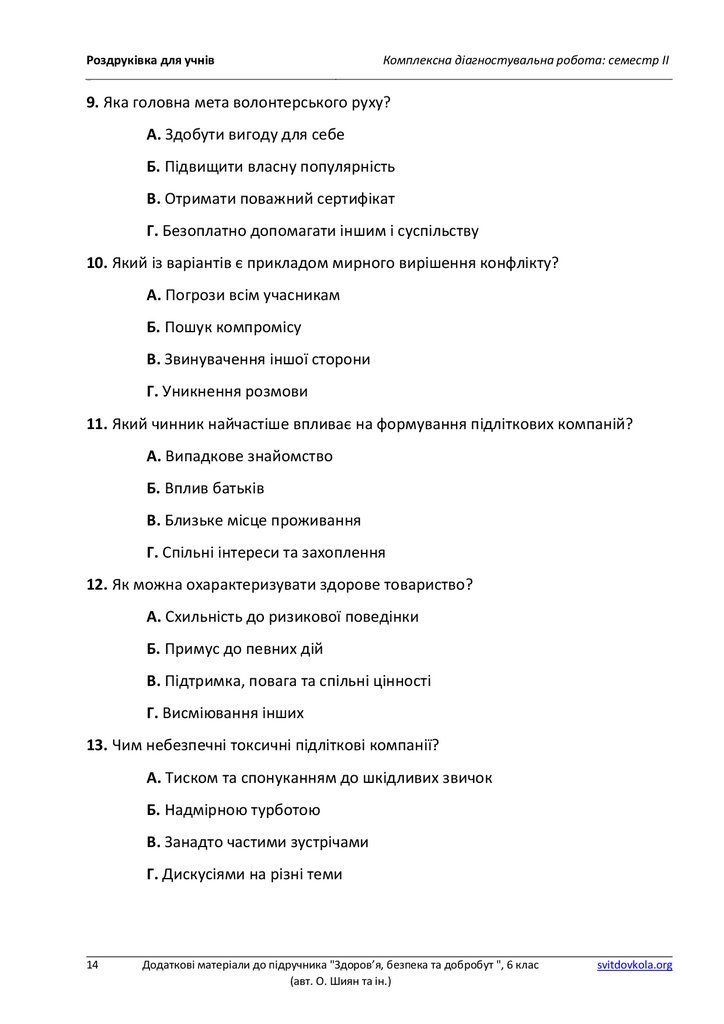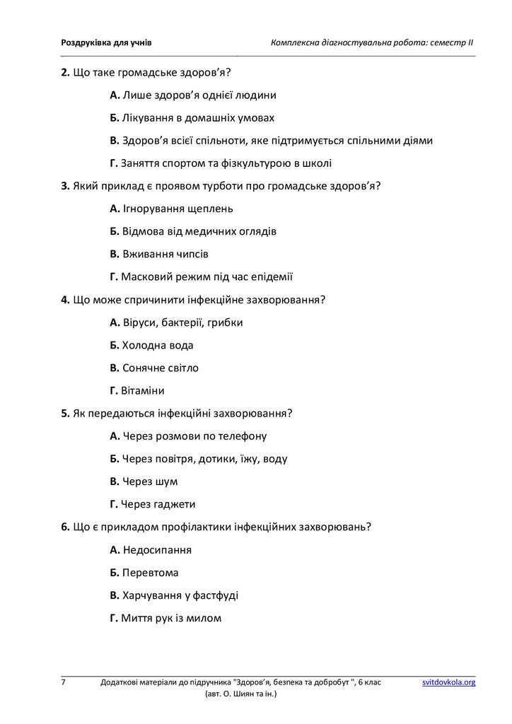 Додаткові матеріали до підручника "Здоров’я, безпека та добробут ", 6 клас