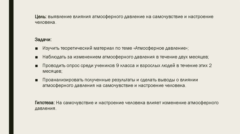 Цель: выявление влияния атмосферного давление на самочувствие и настроениечеловека.