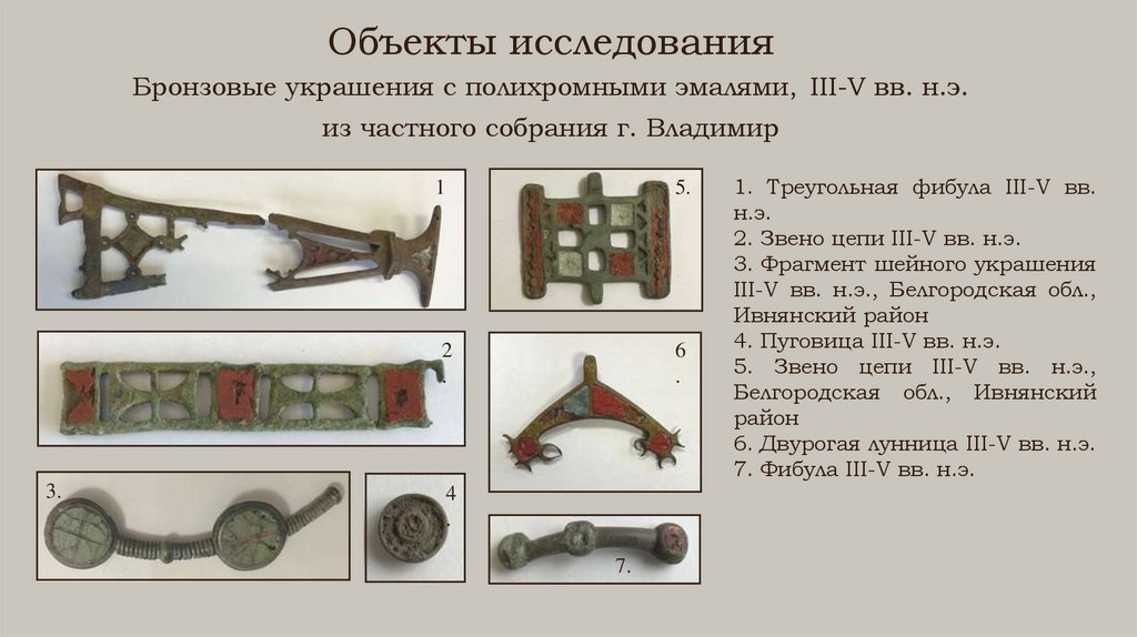 Объекты исследованияБронзовые украшения с полихромными эмалями, III-V вв. н.э.