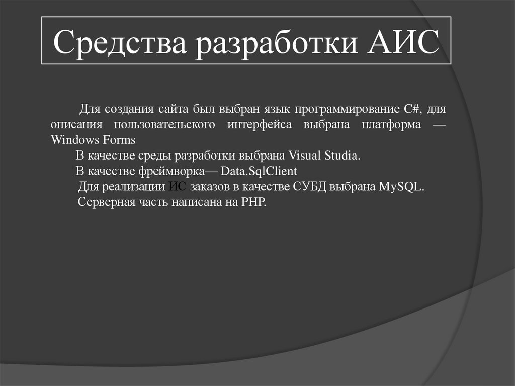 Для создания сайта был выбран язык программирование C#, дляописания пользовательского интерфейса выбрана платформа —