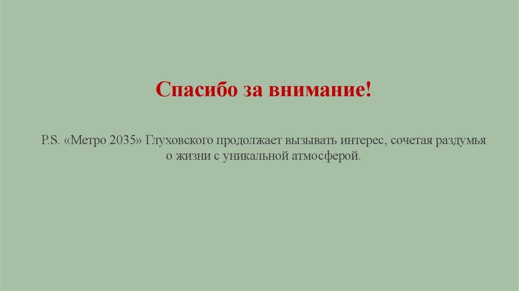 Спасибо за внимание!P.S. «Метро 2035» Глуховского продолжает вызывать интерес, сочетая раздумья