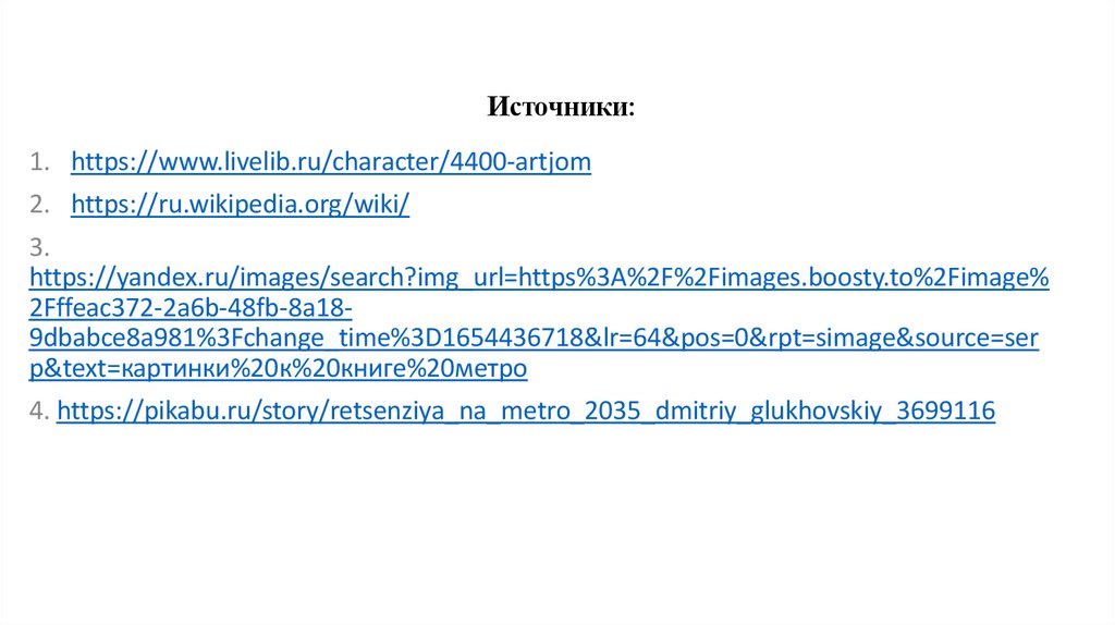 1. https://www.livelib.ru/character/4400-artjom2. https://ru.wikipedia.org/wiki/