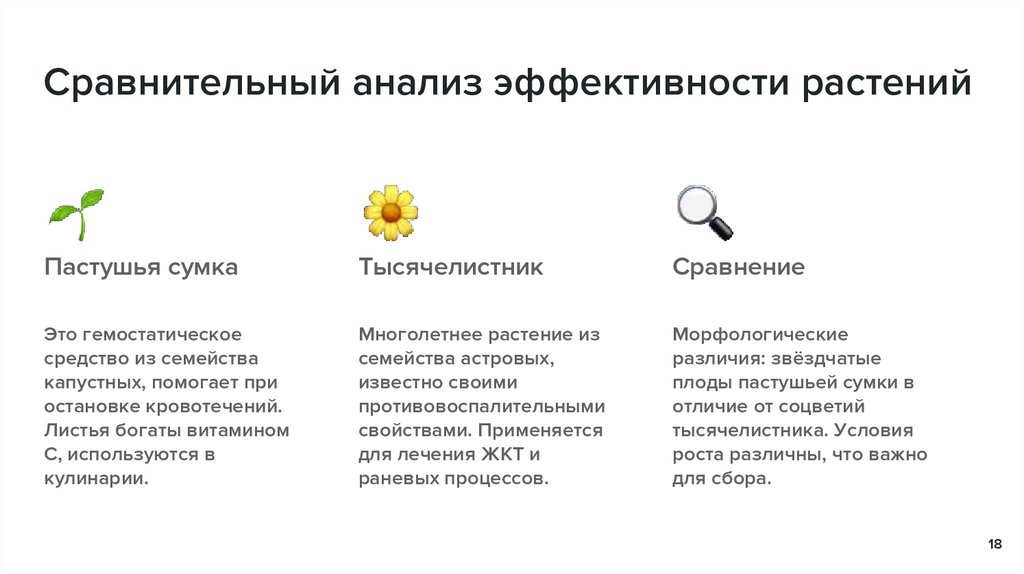 ПроблемаНедостаток информации о сравнительных свойствах тысячелистника и пастушьей сумки в