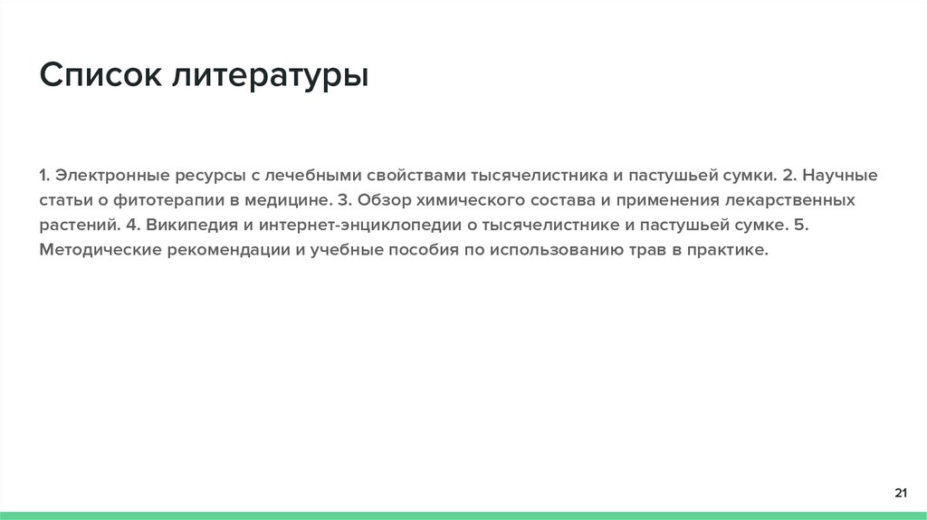 Список литературы1. Электронные ресурсы с лечебными свойствами тысячелистника и пастушьей сумки. 2. Научные