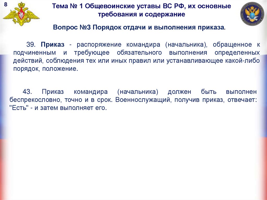 8Тема № 1 Общевоинские уставы ВС РФ, их основные