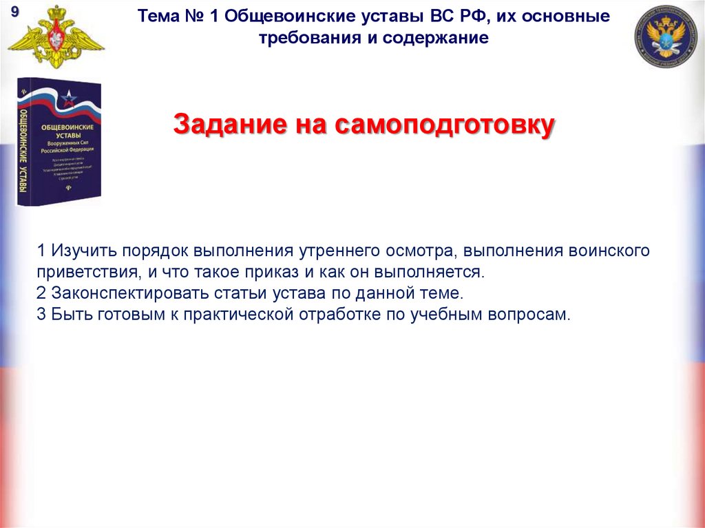 9Тема № 1 Общевоинские уставы ВС РФ, их основные