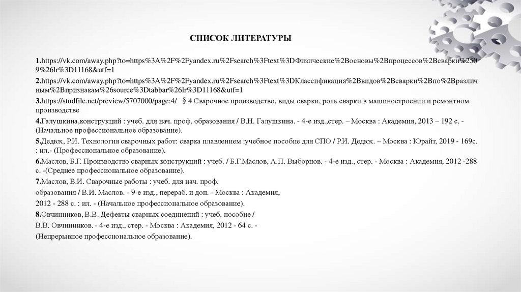 СПИСОК ЛИТЕРАТУРЫ1.https://vk.com/away.php?to=https%3A%2F%2Fyandex.ru%2Fsearch%3Ftext%3DФизические%2Bосновы%2Bпроцессов%2Bсварки%250