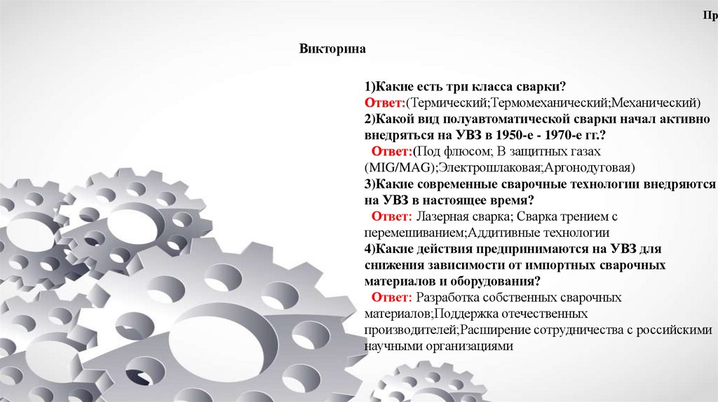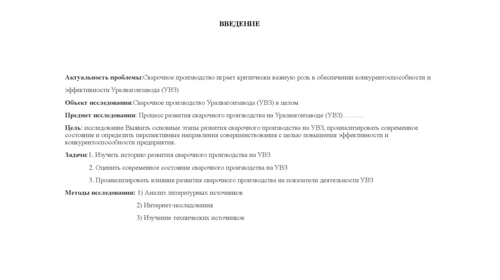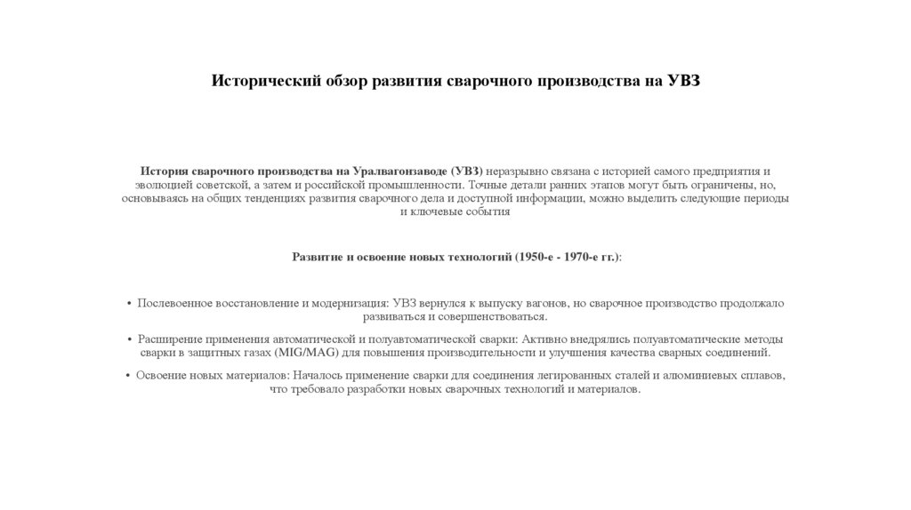 Цель: исследование Выявить основные этапы развития сварочного производства на УВЗ, проанализировать современное