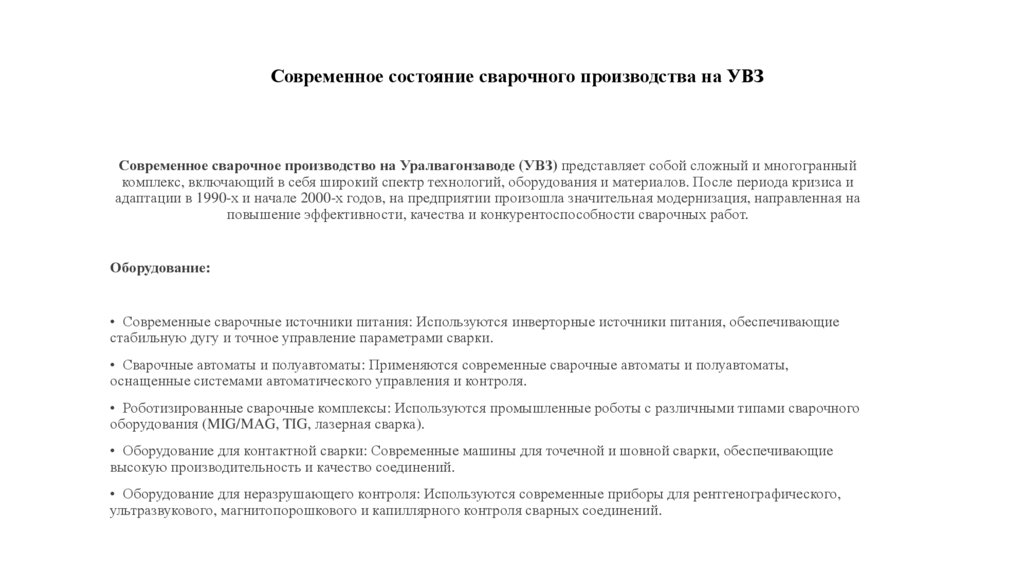 Современное состояние сварочного производства на УВЗСовременное сварочное производство на Уралвагонзаводе (УВЗ) представляет собой сложный и многогранный