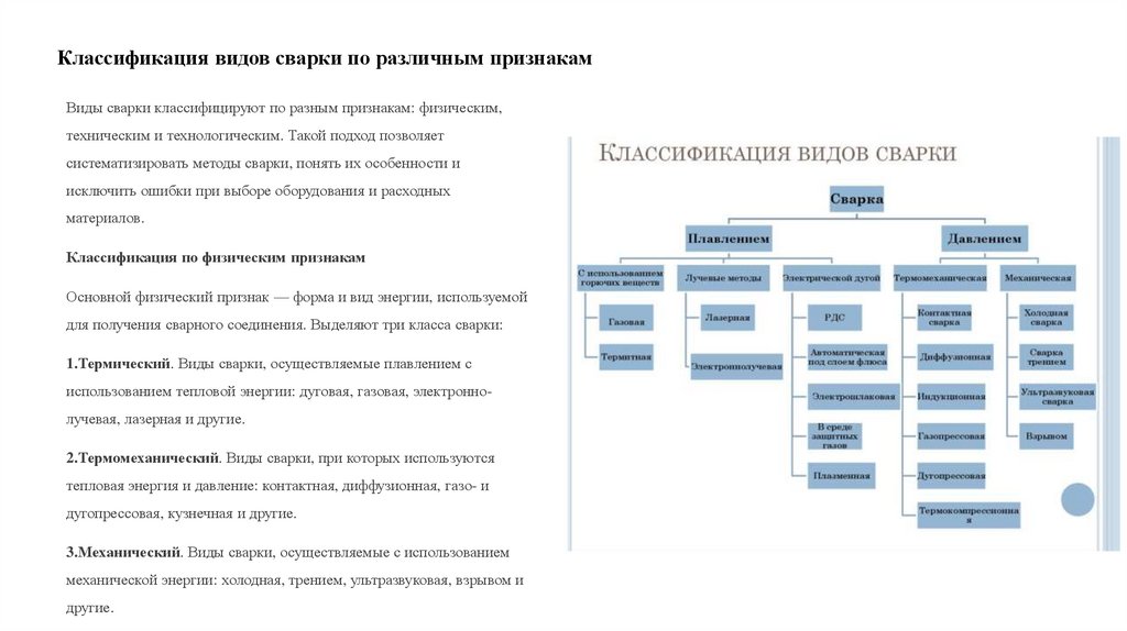 Классификация видов сварки по различным признакамВиды сварки классифицируют по разным признакам: физическим,