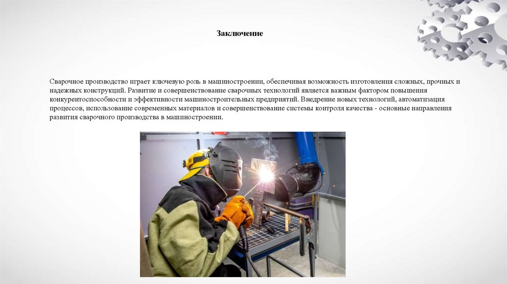 ЗаключениеСварочное производство играет ключевую роль в машиностроении, обеспечивая возможность изготовления сложных, прочных и