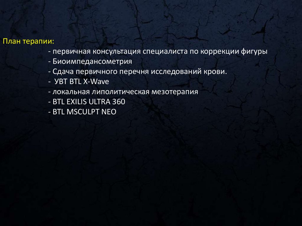 План терапии:- первичная консультация специалиста по коррекции фигуры