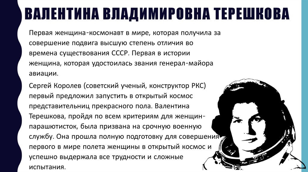 ВАЛЕНТИНА ВЛАДИМИРОВНА ТЕРЕШКОВАПервая женщина-космонавт в мире, которая получила за
