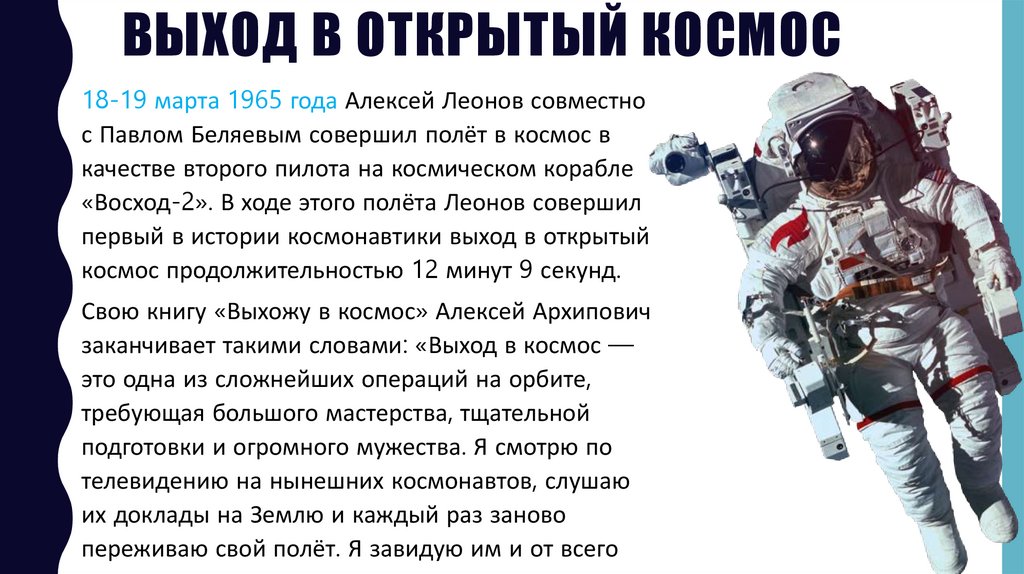 ВЫХОД В ОТКРЫТЫЙ КОСМОС18-19 марта 1965 года Алексей Леонов совместно