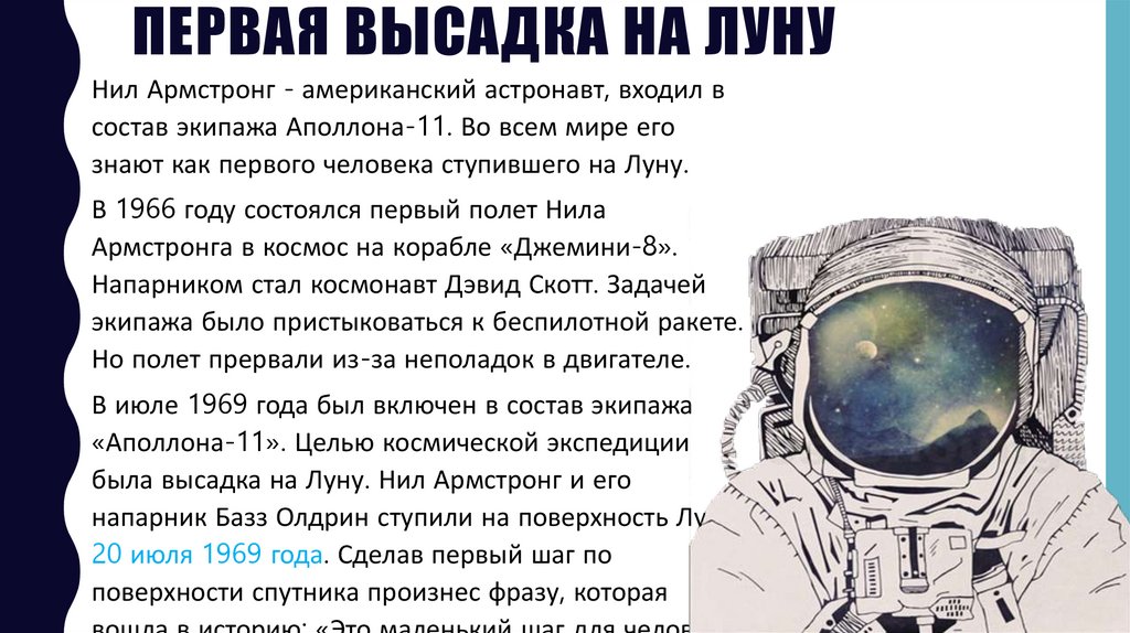 ПЕРВАЯ ВЫСАДКА НА ЛУНУНил Армстронг - американский астронавт, входил в