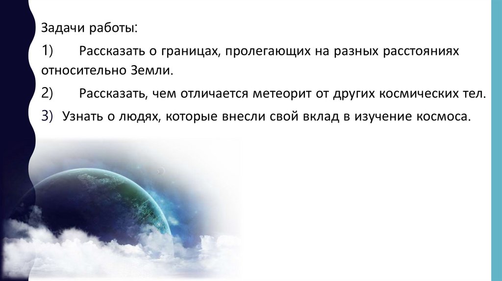 Мы узнали о космосе и первых космонавтах, а также о границах,пролегающих на разных расстояниях относительно Земли., чем