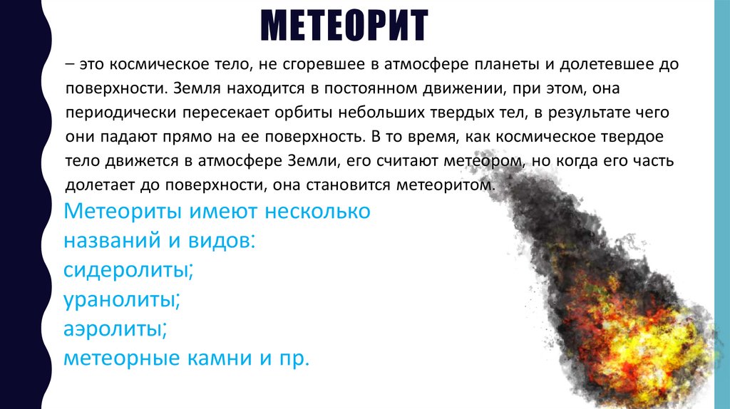 МЕТЕОРИТ– это космическое тело, не сгоревшее в атмосфере планеты и долетевшее до