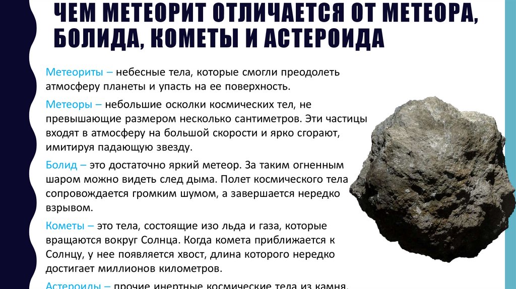 ЧЕМ МЕТЕОРИТ ОТЛИЧАЕТСЯ ОТ МЕТЕОРА,БОЛИДА, КОМЕТЫ И АСТЕРОИДА