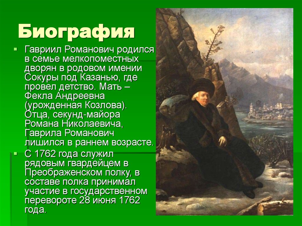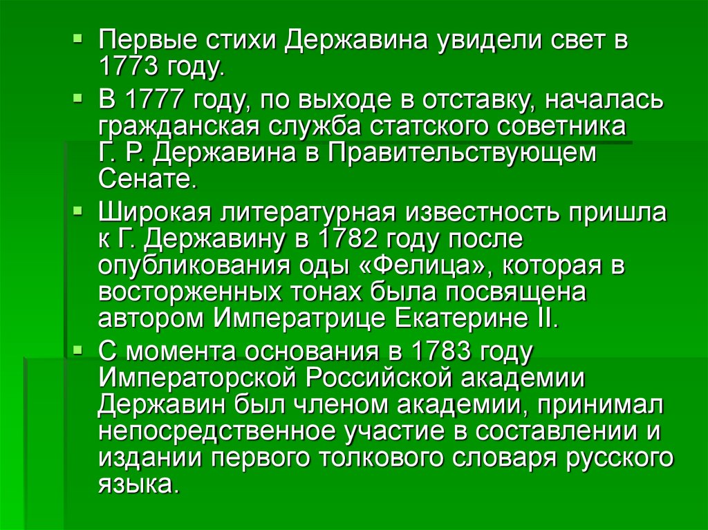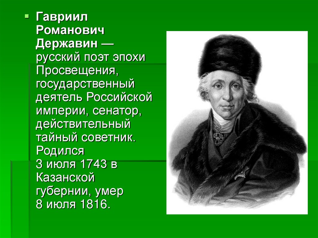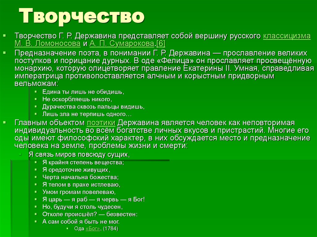 Творчество Г. Р. Державина представляет собой вершину русского классицизмаМ. В. Ломоносова и А. П. Сумарокова.[6]