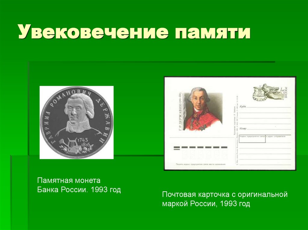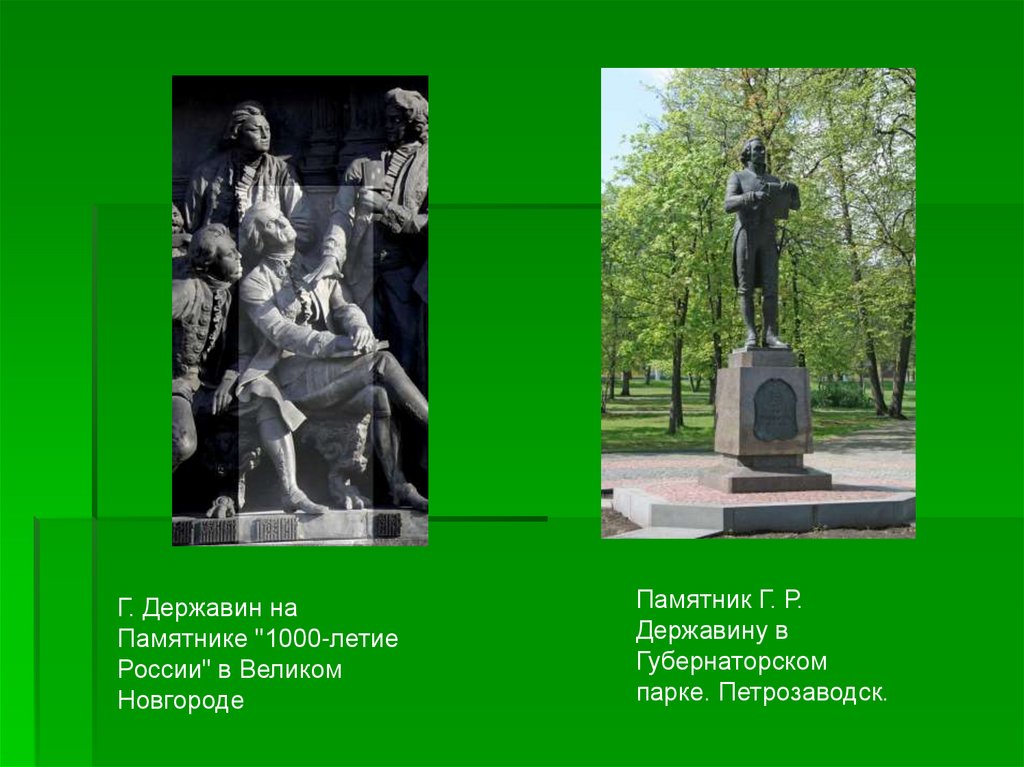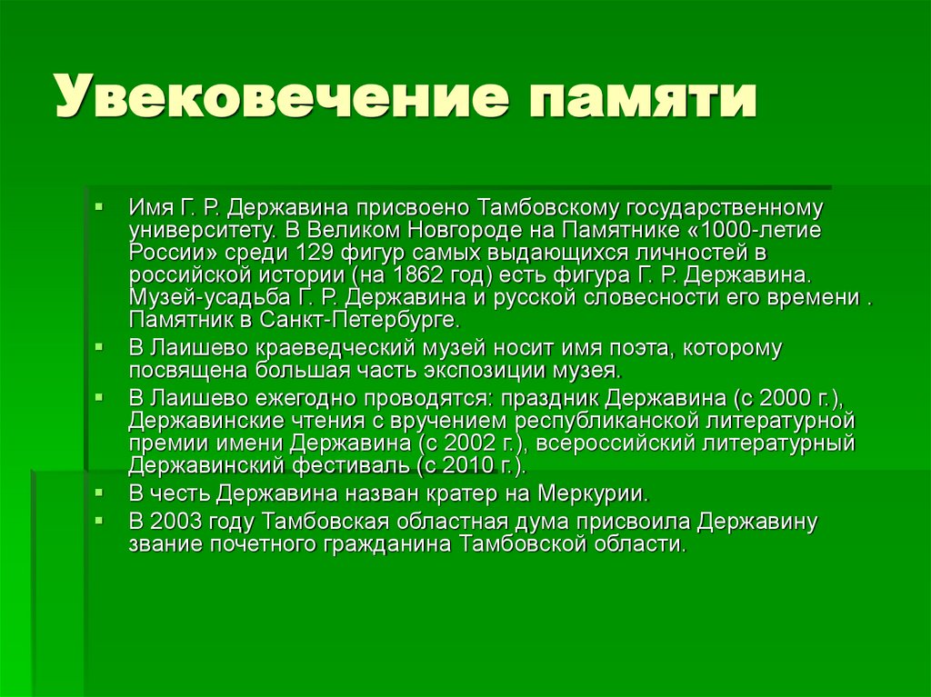 Имя Г. Р. Державина присвоено Тамбовскому государственномууниверситету. В Великом Новгороде на Памятнике «1000-летие