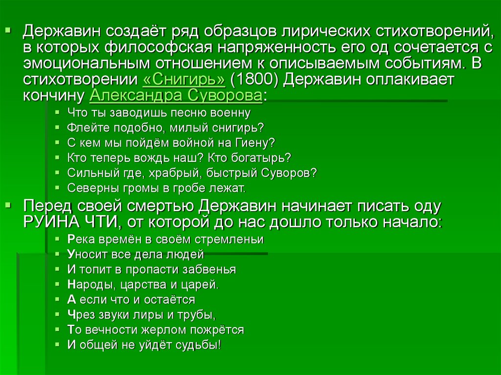 Державин создаёт ряд образцов лирических стихотворений,в которых философская напряженность его од сочетается с