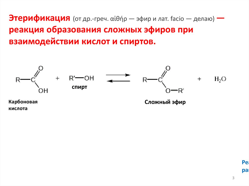 Этерификация (от др.-греч. αἰθήρ — эфир и лат. facio — делаю) —реакция образования сложных эфиров при