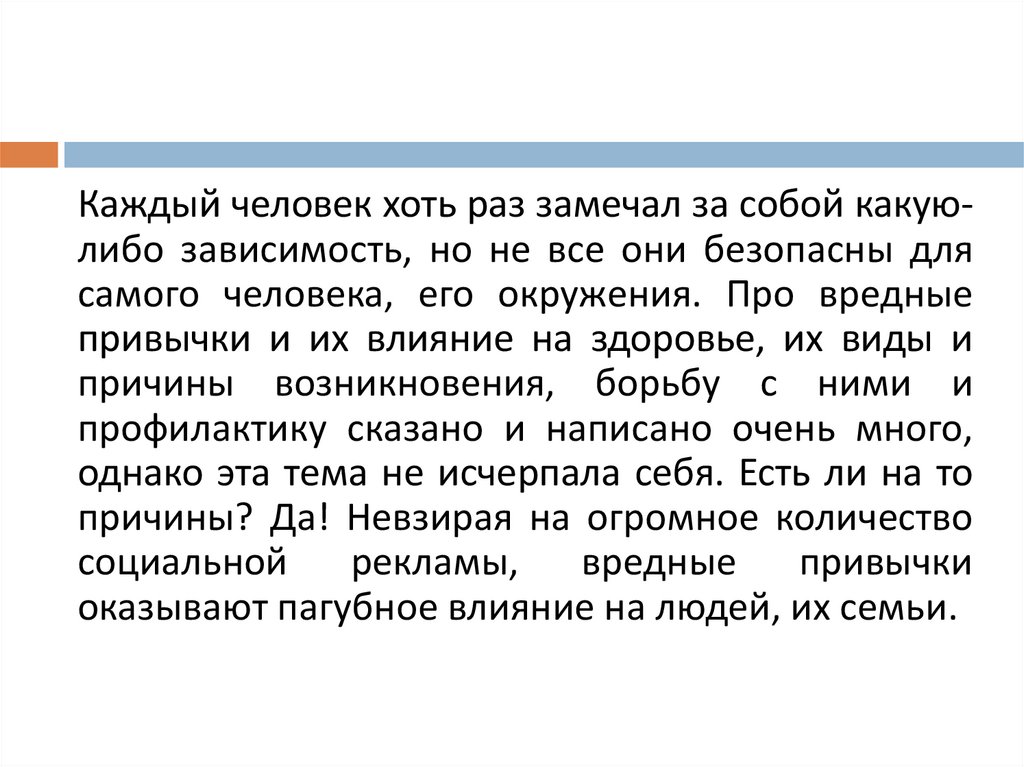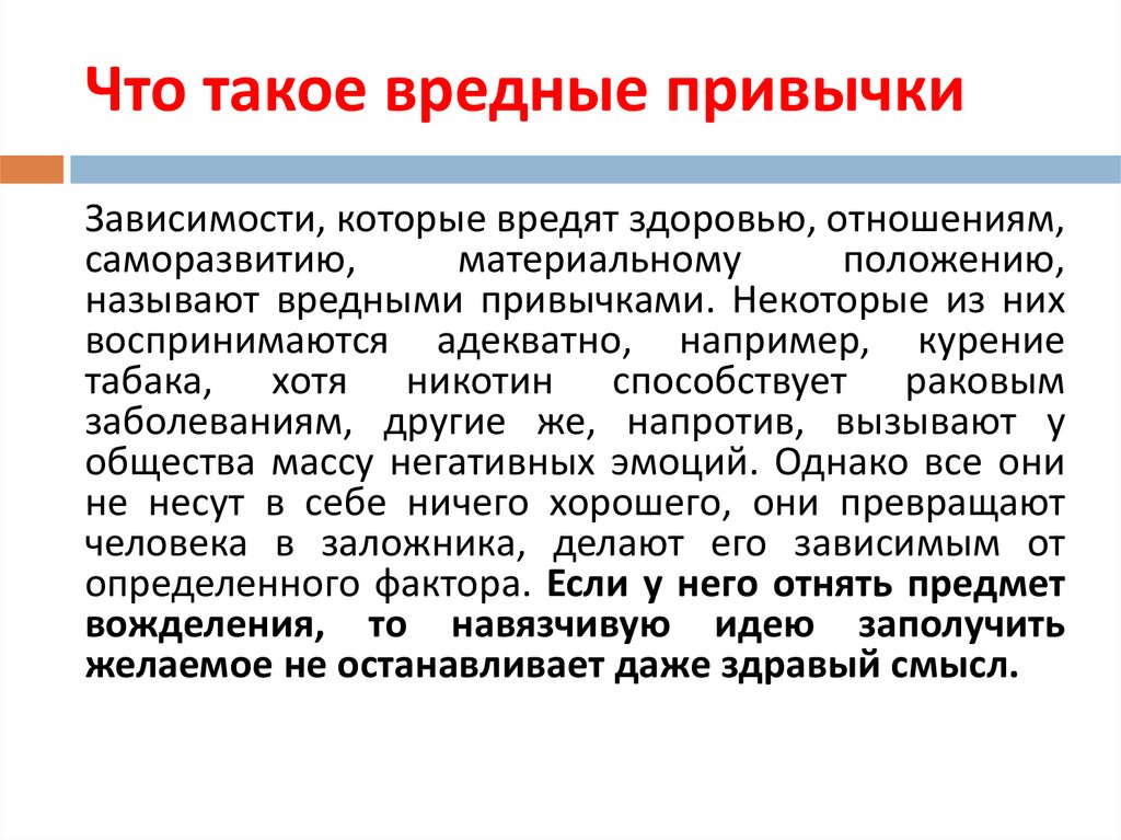 Каждый человек хоть раз замечал за собой какуюлибо зависимость, но не все они безопасны длясамого человека, его окружения. Про вредные