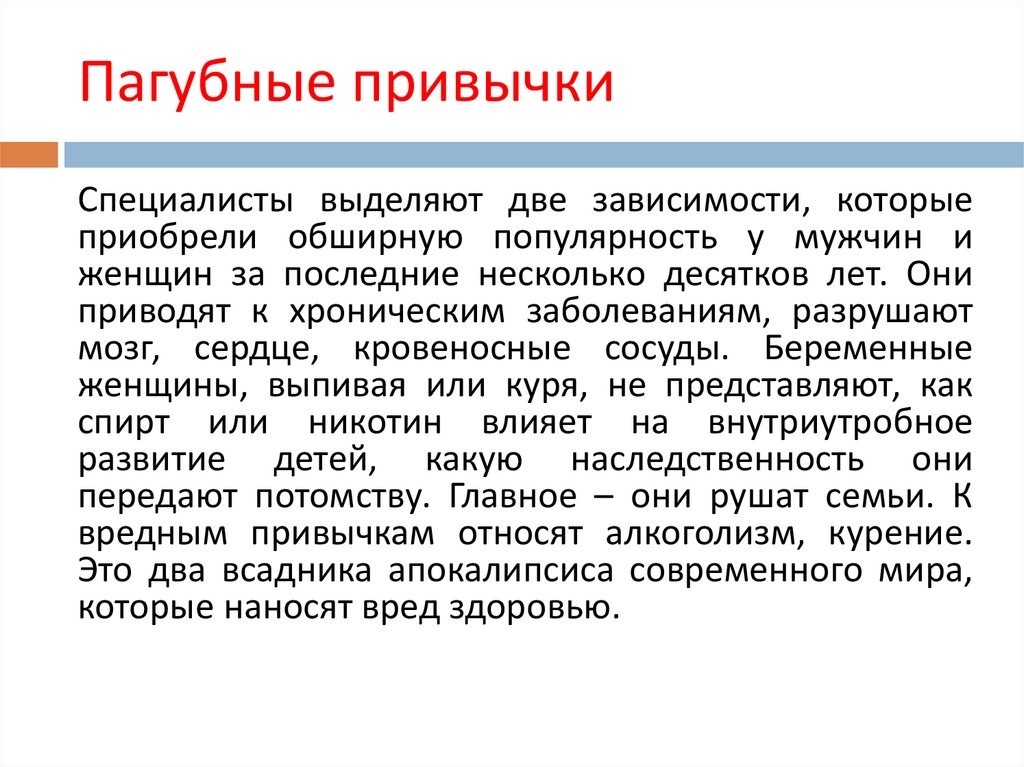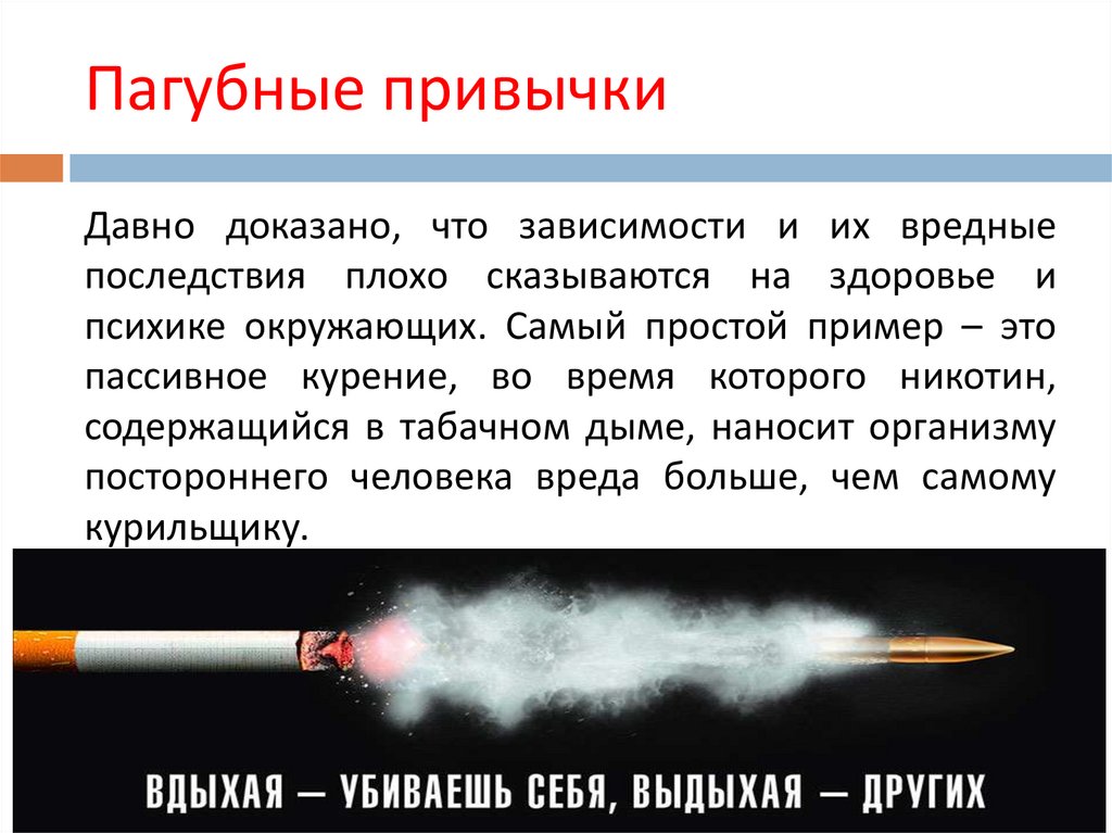 Давно доказано, что зависимости и их вредныепоследствия плохо сказываются на здоровье и