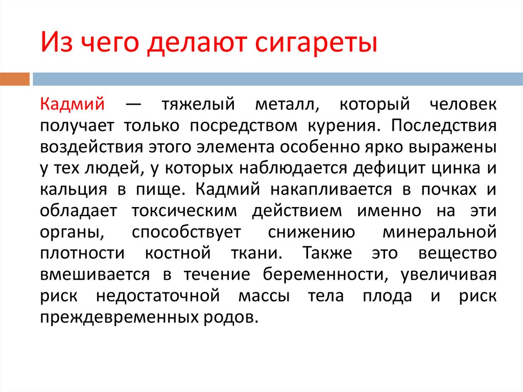 Кадмий — тяжелый металл, который человекполучает только посредством курения. Последствия