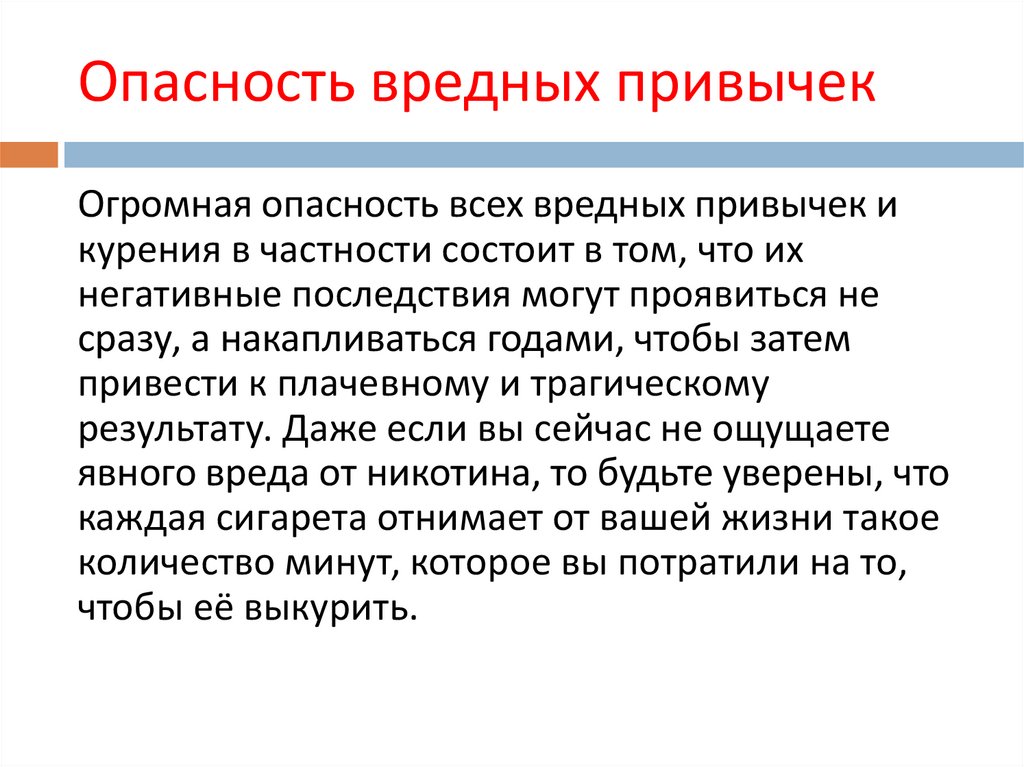 Огромная опасность всех вредных привычек икурения в частности состоит в том, что их