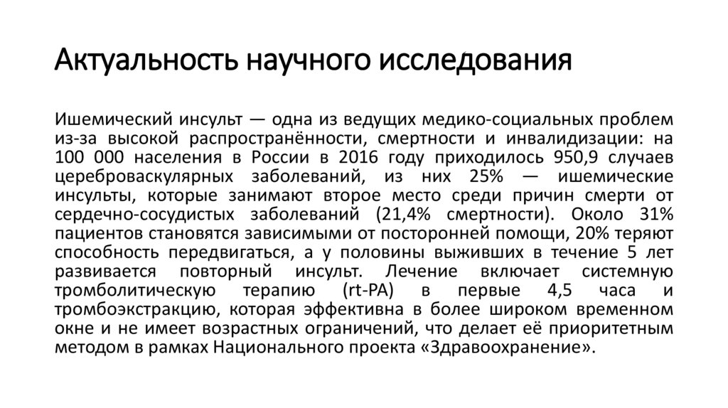 Ишемический инсульт — одна из ведущих медико-социальных проблемиз-за высокой распространённости, смертности и инвалидизации: на