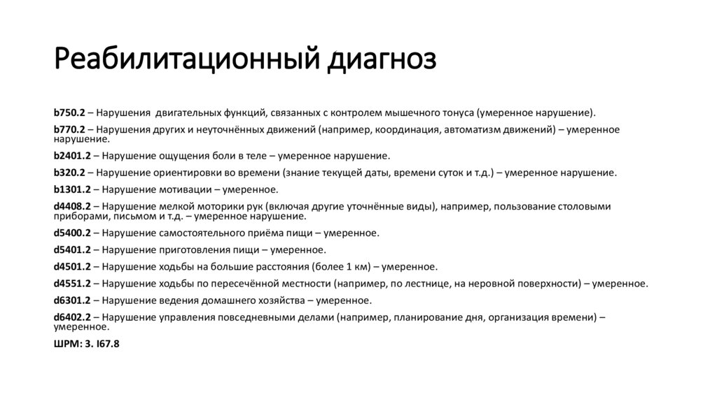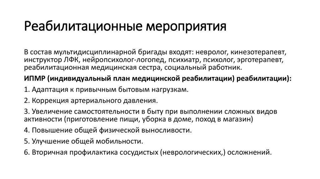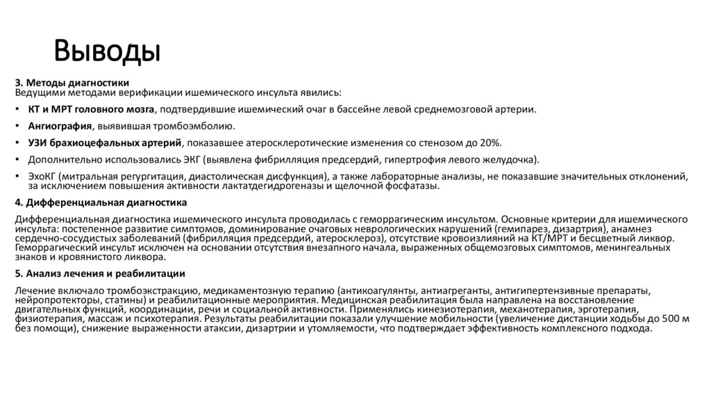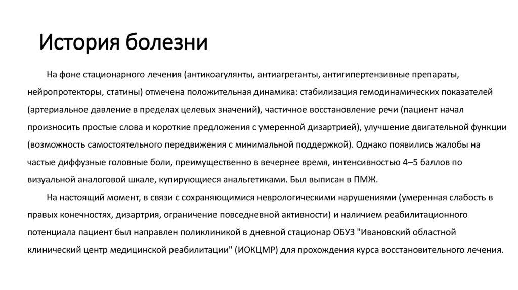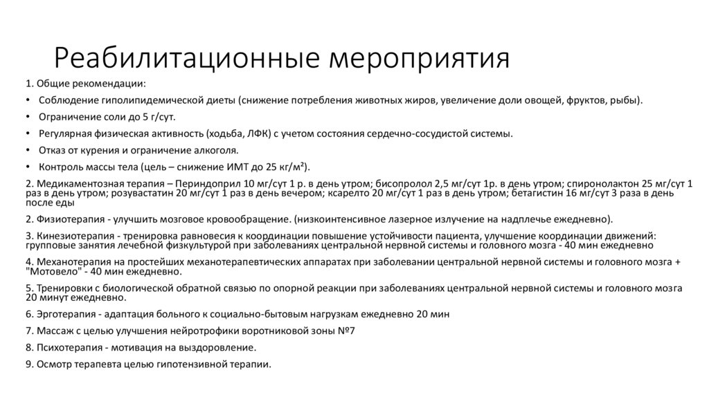 нейропротекторы, статины) и реабилитационные мероприятия. Медицинская реабилитация была направлена на восстановление