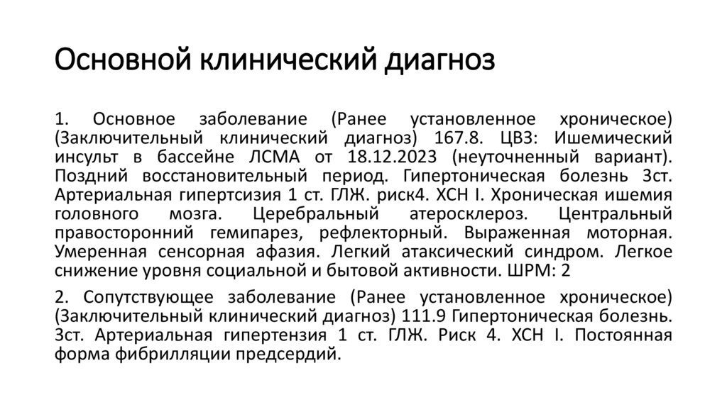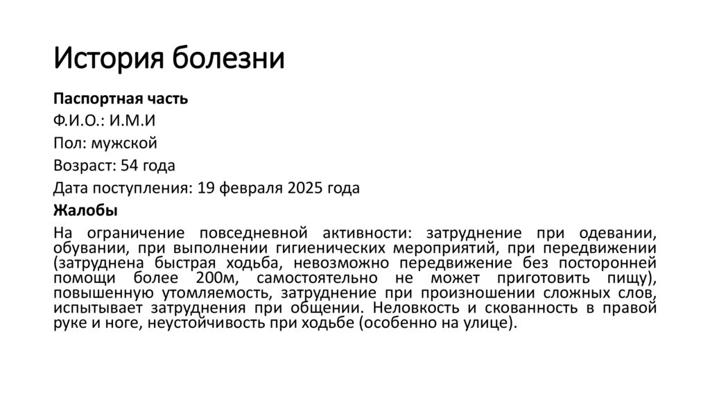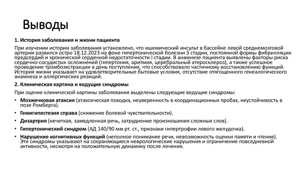 1. История заболевания и жизни пациентаПри изучении истории заболевания установлено, что ишемический инсульт в бассейне левой среднемозговой